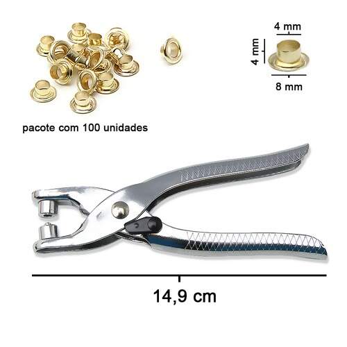 - Alicate para ilhós robusto e resistente, produzido em aço carbono.