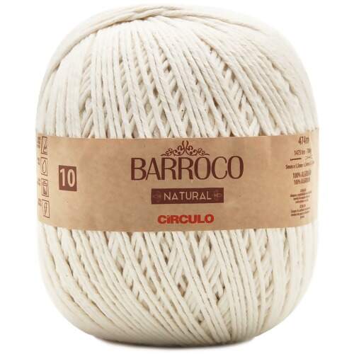 O Barbante Barroco Natural nº 10 de 700g, produzido pela Círculo, é um fio 100% algodão com espessura TEX 1475 e metragem de 474 metros. Ideal para crochê e tricô, destaca-se pela maciez e suavidade, sendo perfeito para a confecção de tapetes e acessórios de decoração. Recomenda-se o uso de agulhas de crochê entre 5 mm e 7 mm, ou de tricô entre 6,5 mm e 8 mm, para melhores resultados.