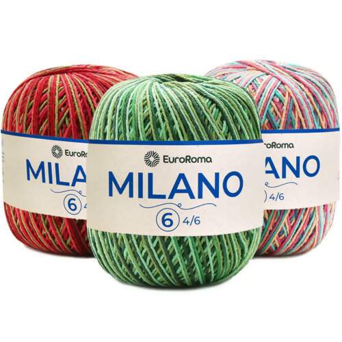 O Barbante EuroRoma Milano possui 6 fios e é um barbante mesclado ideal para diversos segmentos da decoração. Desde tapeçaria de cozinha e banheiro até a confecção de flores para aplicação em diversos trabalhos (tapetes, mantas, almofadas...). EuroRoma Milano é uma explosão de cores com três tons que proporcionam uma combinação perfeita para decorar e produzir peças modernas, alegres e bonitas. Além da variação de cor, as peças produzidas com EuroRoma Milano possuem toda a maciez e qualidade que você busca para seus trabalhos manuais, com a certeza de cores firmes, sem deixar de ser sustentável.