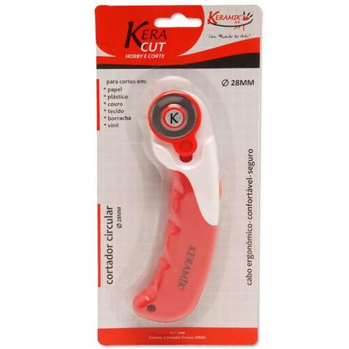 O cortador é de resina plástica com 1 lâminas de aço de 28mm de diâmetro.
