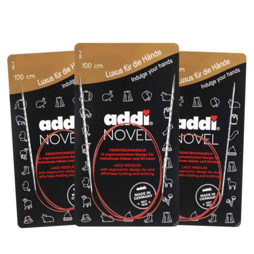 Agulhas de tricô circulares premium ADDI com um novo design ergonômico especial e pontas de renda para trabalhos de precisão - este novo estilo de agulha é de particular interesse para quem acha desconfortável segurar agulhas convencionais e para quem sofre de artrite nas mãos.