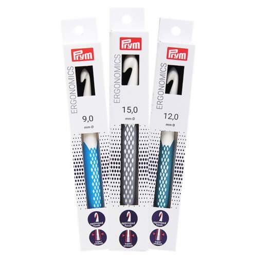 As pontas são altamente polidas, garantindo um fácil deslizamento dos pontos, garantindo um crochê confortável e fácil. Seu design ergonômico e o manuseio seguro contribuem para um trabalho agradável e sem fadiga. Consiste em um material plástico antiderrapante que dá ao gancho de crochê o aperto necessário. O código de cores na extremidade superior da empunhadura que identifica o medidor de agulha significa que a agulha de crochê desejada pode ser encontrada rapidamente na cesta de artesanato. A agulha de crochê prym ergonomics foi premiada com o Red Dot Design Award em 2014.