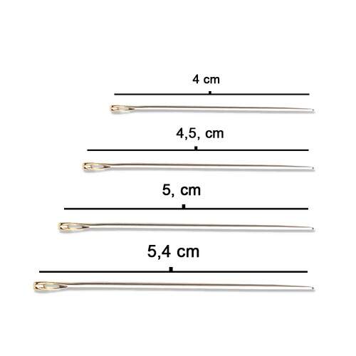 Agulhas compridas com olhos redondos usadas para: confecção de gorros e chapéus, plissados, fitas, bordados e enfeites.
