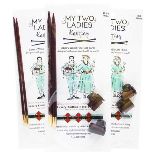 As agulhas de luxo ergonômicas patenteadas My Two Ladies® são feitas à mão por artesãos de marcenaria em jacarandá sólido e são polidas à mão para um brilho brilhante, criando uma experiência de tricô suave e sem obstáculos.