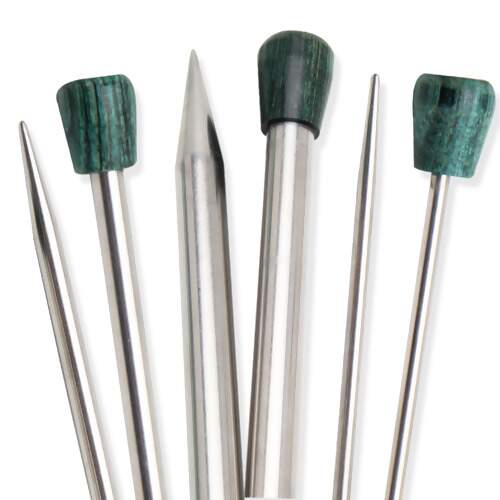 Confeccionado em aço inox de alta qualidade, o acabamento acetinado é sedoso ao toque e garante um deslizamento suave para todos os fios. As tampas de madeira decoradas são impressas com o símbolo Mandala.