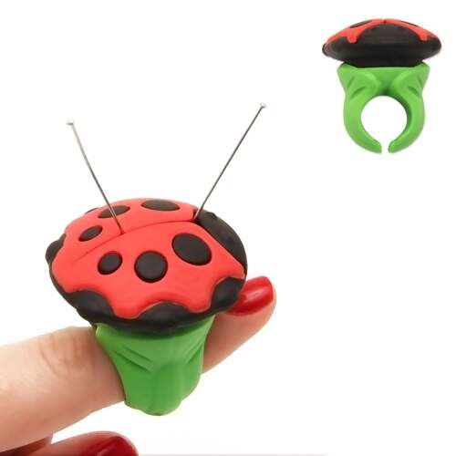 Alfineteiro anel em formato de joaninha, composto em borracha. Feito para fixar os alfinetes de forma prática. Ideal para utilizá-lo sempre em costuras e artesanatos.