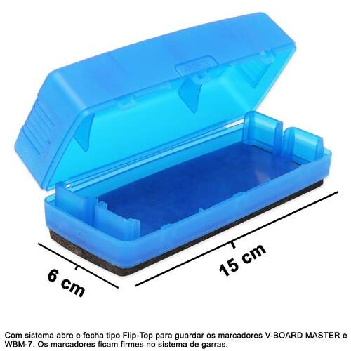 Com sistema abre e fecha tipo Flip-Top para guardar os marcadores V-BOARD MASTER e WBM-7. Os marcadores ficam firmes no sistema de garras.