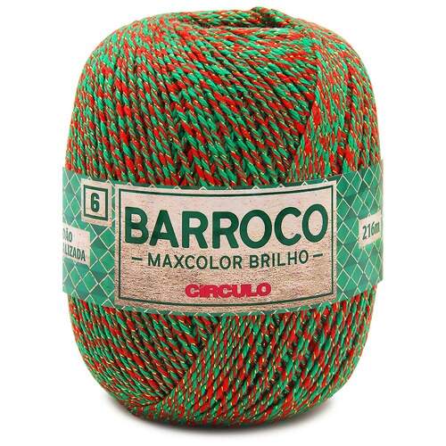 O Barbante Barroco Maxcolor Brilho nº 6 de 200g, Edição Especial de Natal da Círculo, é um fio que combina 98% de algodão com 2% de fibra metalizada, proporcionando um brilho sutil e sofisticado às suas criações. Com 216 metros de comprimento e espessura TEX 922, é ideal para confeccionar peças natalinas e itens de decoração que buscam um toque festivo e elegante. Recomenda-se o uso de agulhas de crochê entre 3,5mm e 5,0mm, ou de tricô entre 5,5mm e 7,0mm, para obter resultados impecáveis.