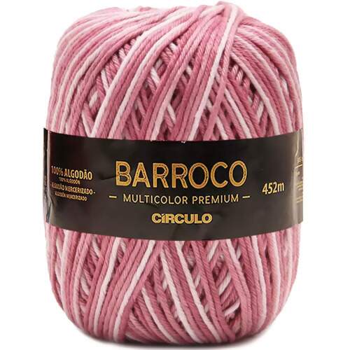 O Barbante Barroco Multicolor Premium 400g, produzido pela Círculo, é um fio 100% algodão mercerizado que se destaca pelo brilho intenso e pela riqueza de cores mescladas. Com espessura TEX 885 e 452 metros de comprimento, é especialmente indicado para projetos de tapeçaria e decoração, conferindo sofisticação e durabilidade às peças artesanais. Recomenda-se o uso de agulhas de crochê entre 3,0mm e 4,5mm, ou de tricô entre 4,5mm e 5,5mm.