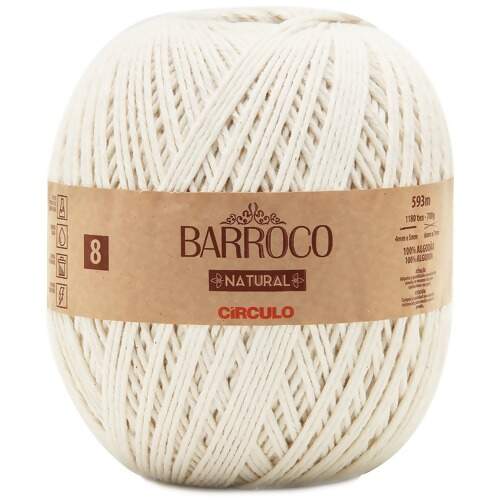 O Barbante Barroco Natural nº 8 de 700g, da Círculo, é um fio 100% algodão com espessura TEX 1180 e metragem de 593 metros. Ideal para crochê e tricô, destaca-se pela maciez e suavidade, sendo perfeito para a confecção de tapetes e outros acessórios de decoração. Recomenda-se o uso de agulhas de crochê entre 4 mm e 5 mm, ou de tricô entre 6 mm e 7 mm, para melhores resultados.