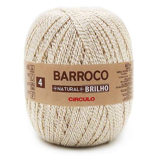 O Barroco Natural Brilho é o tradicional Barroco Natural, com detalhe de um lindo fiozinho de brilho ouro. Barroco Natural é um fio 100% algodão puro, sem processos químicos, desenvolvido especialmente para a base de trabalhos manuais. Diferente dos barbantes comuns, possui toque e maciez incomparável, que garante uma durabilidade muito maior às suas artes manuais.