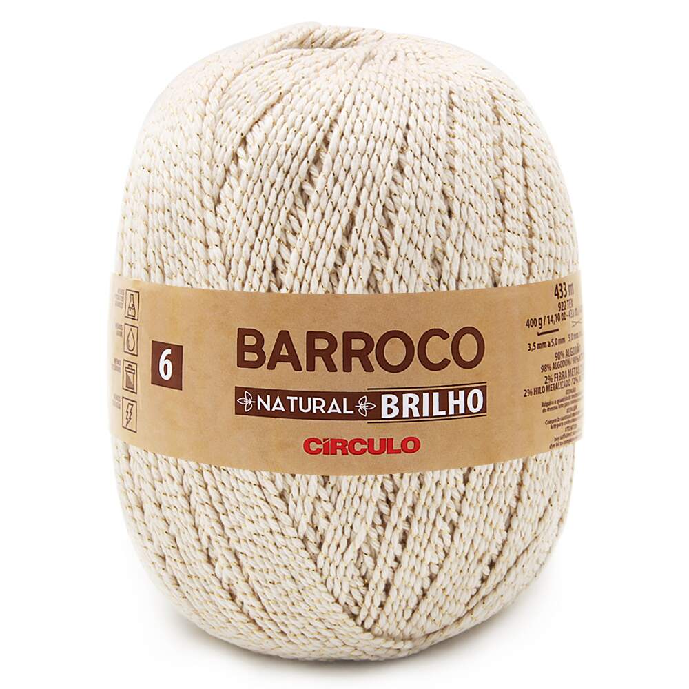 O Barroco Natural Brilho é o tradicional Barroco Natural, com detalhe de um lindo fiozinho de brilho ouro. Barroco Natural é um fio 100% algodão puro, sem processos químicos, desenvolvido especialmente para a base de trabalhos manuais. Diferente dos barbantes comuns, possui toque e maciez incomparável, que garante uma durabilidade muito maior às suas artes manuais.