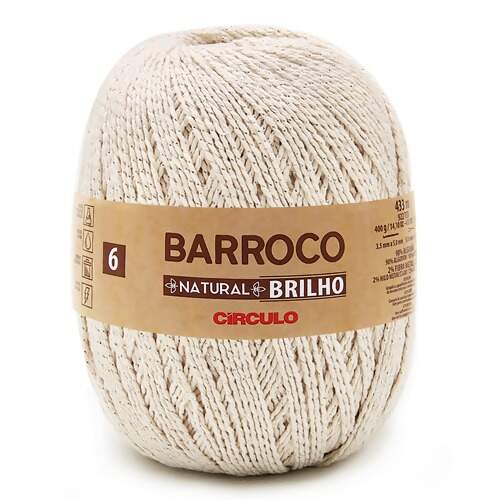 O Barroco Natural Brilho é o tradicional Barroco Natural, com detalhe de um lindo fiozinho de brilho ouro. Barroco Natural é um fio 100% algodão puro, sem processos químicos, desenvolvido especialmente para a base de trabalhos manuais. Diferente dos barbantes comuns, possui toque e maciez incomparável, que garante uma durabilidade muito maior às suas artes manuais.