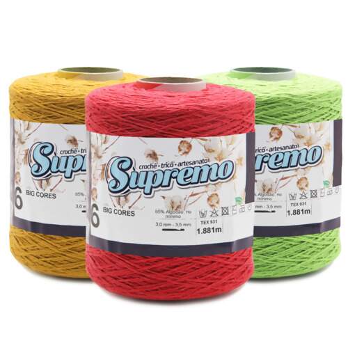 Barbante Big Supremo N.06 1,8 Kg, é ideal para trabalhos de crochê, tricô e artesanato em geral. Produzido com algodão de alta qualidade, possui textura macia e excelente rendimento, perfeito para criar peças como tapetes, jogos de banheiro, cachepôs, porta trecos, mantas, almofadas, abajures e muito mais.. Com cores vibrantes e rígidas, é uma escolha prática e versátil para projetos que desbloqueiam beleza e durabilidade.