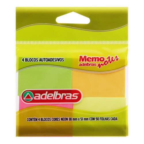 Descrição Bloco Adesivo Adelbras Cores Neon 38x51mm 4 Und de 50Fls