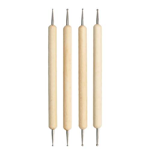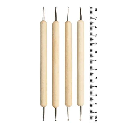 Boleador de metal com ponta dupla e corpo de madeira. São 4 pontas no formato elipse com tamanhos diferentes. O Boleador é uma ferramenta indicada para escultura, modelagem, biscuit e decoração de unhas.