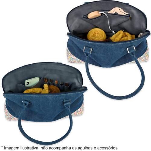 Pode transportar até 400 gramas de fios, projetada com bolsos internos abertos e com zíper, além de bolsos que podem acomodar até 5 agulhas intercambiáveis