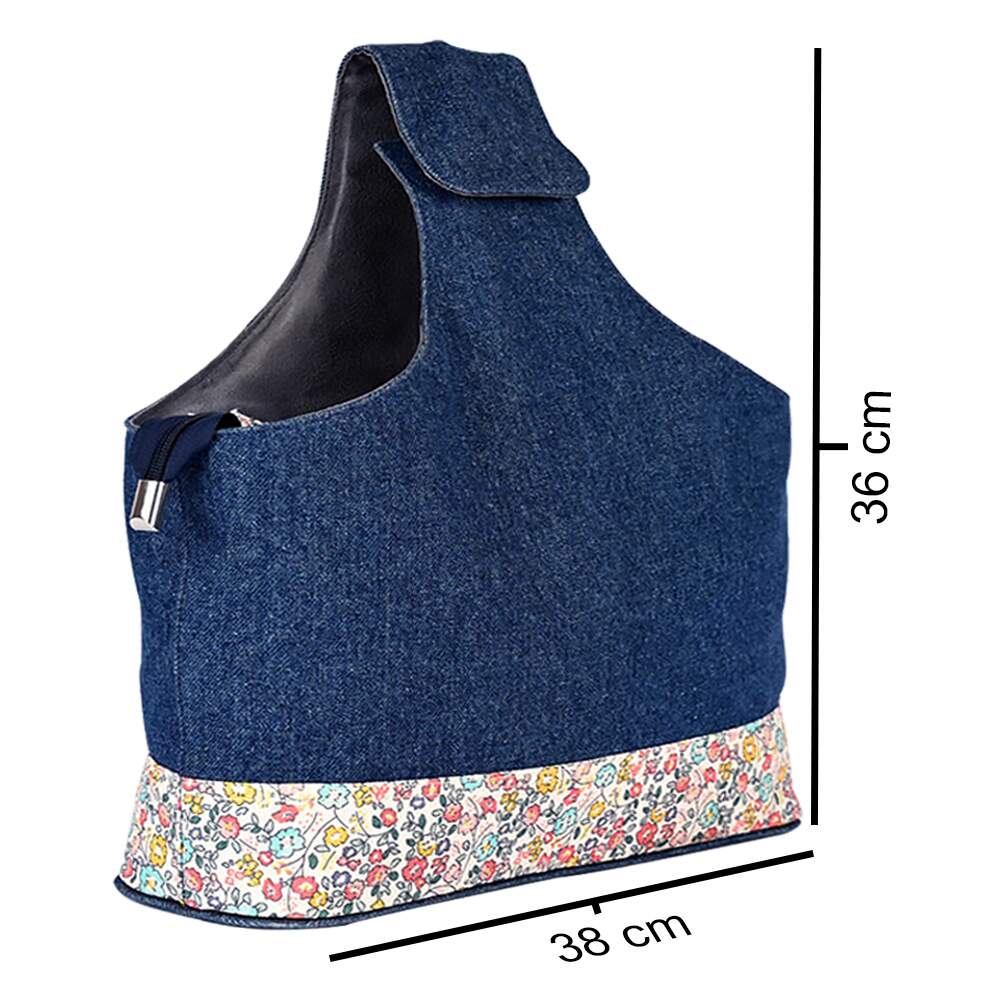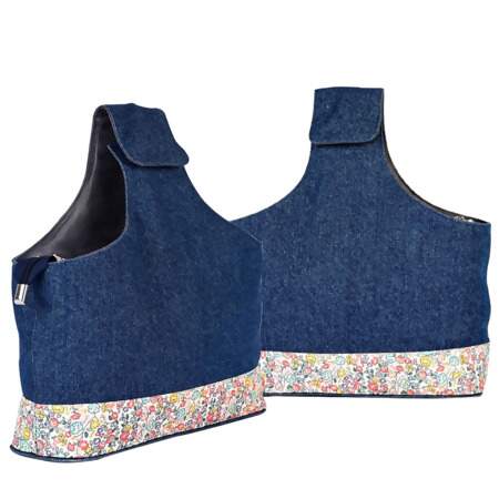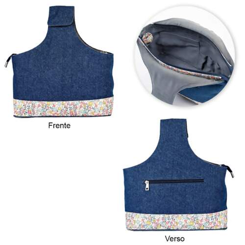 É feita de jeans e algodão estampado floral com forro interno de camurça.
