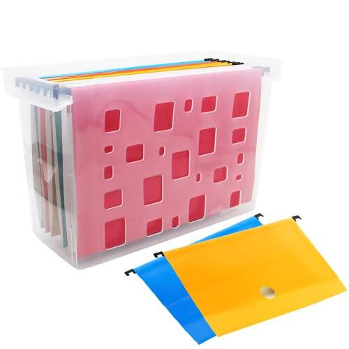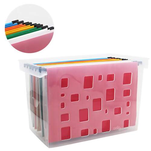 Caixa para arquivo em polipropileno vazado com 6 pastas suspensas coloridas. Acompanha grampo plástico, visor e etiqueta.