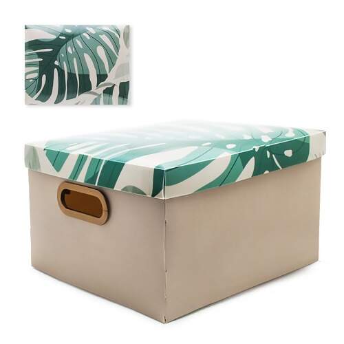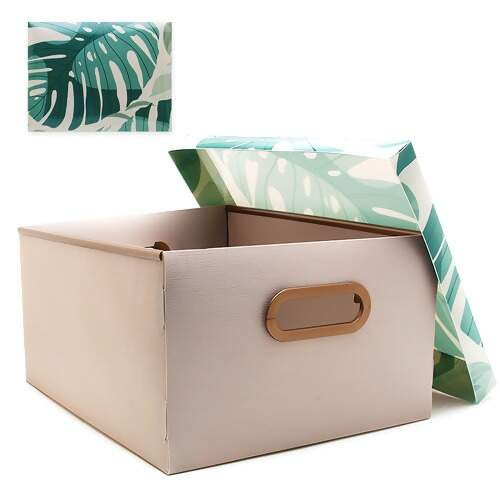 A Caixa Organizadora Baixa Média Folhagem possui a base marrom com textura do tipo linho e tampa estampada com motivos de folhagens que evocam as sensações de frescor e bem-estar que a natureza emana.