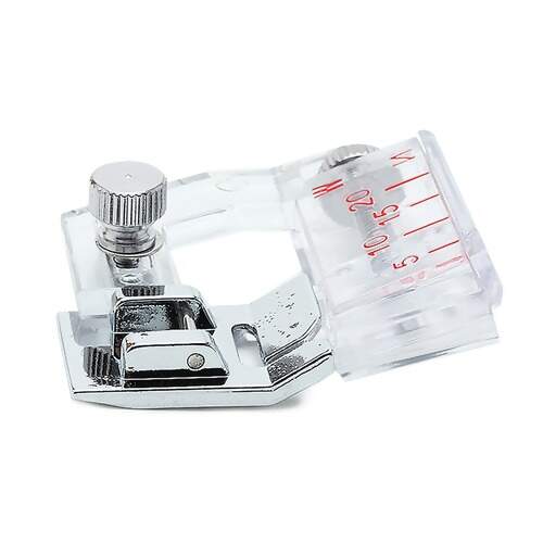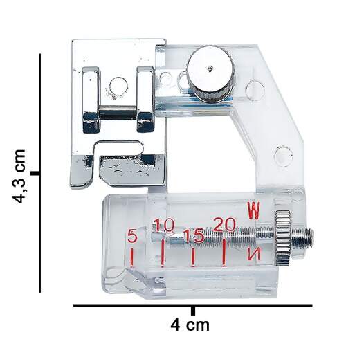 Guia e executa a colocação do Viés. A finalização da peça ficará muito mais simples e rápida com a utilização deste acessório. O calcador deve ser fixado na máquina de costura. Indicado para máquinas domésticas. Possui regulagem de 5 a 20mm.