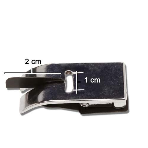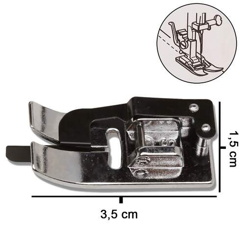 Usado para fazer a costura na emenda entre dois tecidos, o guia que a peça possui se ajusta na vala, permitindo uma costura perfeitamente reta.
