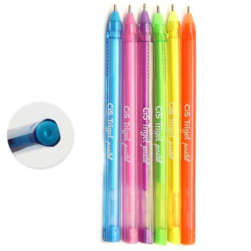 As canetas trigel da CIS com 6 cores diferentes em tons pastéis, seu material é composto de resinas termoplásticas, tinta à base de solventes e corantes orgânicos. O manuseio da caneta é suave e requere pouco esforço.