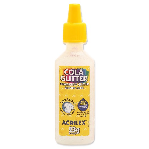 Foi desenvolvida para trabalhos escolares e artesanais. Ideal para atividades de desenvolvimento artístico. Possui um exclusivo bico aplicador que facilita a pintura, podendo ser usada também com esponja ou pincel, para fazer colagens, decorar e pintar sobre papel, papel cartão e cartolina. A Cola Glitter Acrilex não é tóxica e possui brilho intenso.
