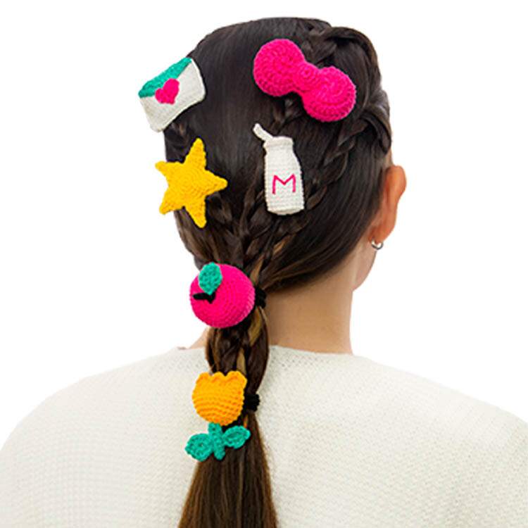 A Coleção de Acessórios Hello Kitty reúne todo o charme da personagem em 6 peças únicas: 4 presilhas estilo bico de pato e 2 amarradores de cabelo confeccionados com o fio Amigurumi Slim, perfeito para trabalhos pequenos e cheios de detalhes.