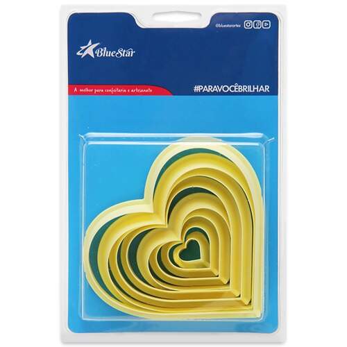Acrescente mais amor às suas criações com os cortadores em formato de Coração da BlueStar. São oito cortadores de tamanhos diferentes na mesma embalagem para você fazer desde grandes peças até pequenos apliques.