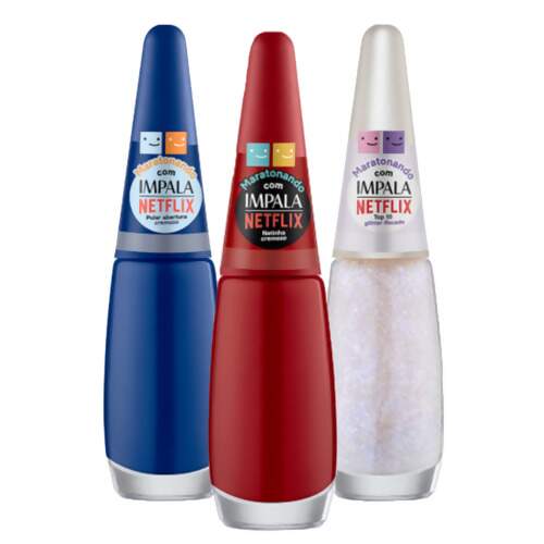 O Esmalte Impala Coleção Netflix Maratonando traz cores cheias de personalidade para combinar com cada mood das suas maratonas. Oferece cobertura intensa, brilho duradouro e secagem rápida. São tons modernos, vibrantes e cheios de atitude, perfeitos para quem ama estar na moda enquanto curte suas séries favoritas. Ideal para quem busca estilo, qualidade e uma esmaltação impecável.
