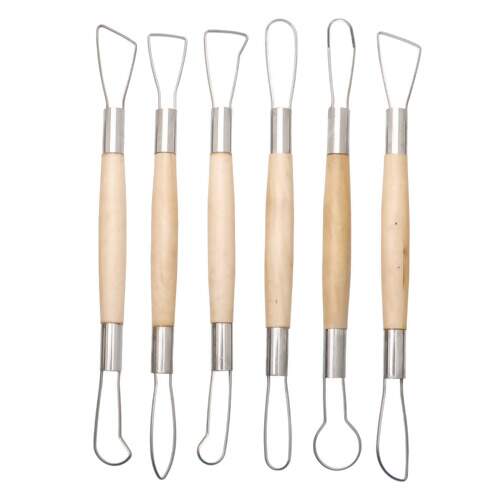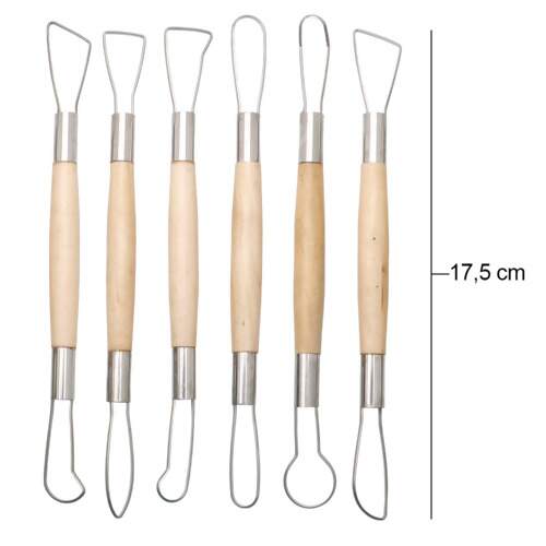 Kit composto por 6 estecas de ponta dupla: totalizando 12 pontas de arames, todas com formatos diferentes para raspar, cavar ou modelar.