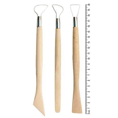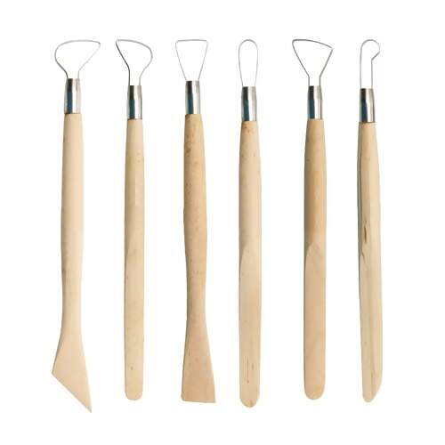 Esteca com Arame e Madeira nas pontas para técnicas de escultura e modelagem. É uma ferramenta de arco grande em uma ponta com cortes diferentes e madeira em outra ponta com formatos diferentes e cabo de madeira. Estecas em um kit de 6 peças, indicada para argila e modelagem com massas em geral.