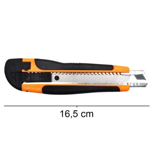 Estilete com lâmina 18mm. Para cortes em papel, tecido, vinil, couro e uso doméstico. Com trilho metálico e com auto trava.