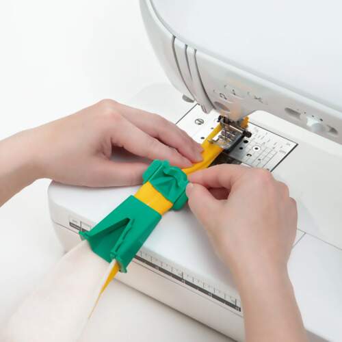 O fabricante de tubos de tecido elimina a necessidade de dobrar e cortar manualmente o tecido e as tiras de rebatidas antes de costurar. Insira seu sanduíche de tira na ferramenta e puxe-o facilmente. A ferramenta dobra as laterais das tiras e depois dobra ao meio, pronta para costurar.