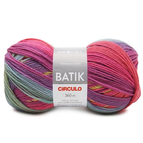 Fio 100% acrílico com efeito de cores obtido através do Batik, técnica de tingimento em tecido artesanal. Esta técnica é originária da ilha de Java na Indonésia e foi adaptada especialmente para esse fio. O efeito final na peça é belíssimo e os efeitos criados harmonizam com diversos estilos.