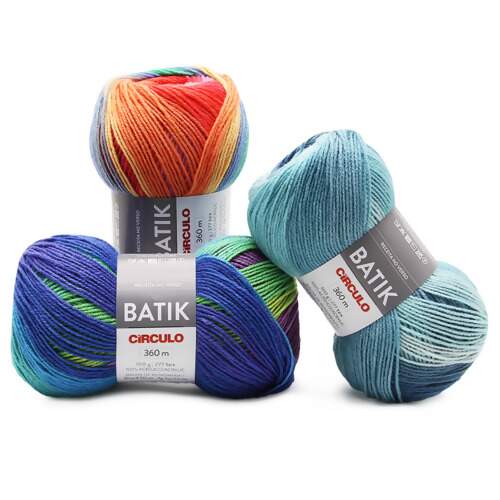 Fio 100% acrílico com efeito de cores obtido através do Batik, técnica de tingimento em tecido artesanal. Esta técnica é originária da ilha de Java na Indonésia e foi adaptada especialmente para esse fio. O efeito final na peça é belíssimo e os efeitos criados harmonizam com diversos estilos.