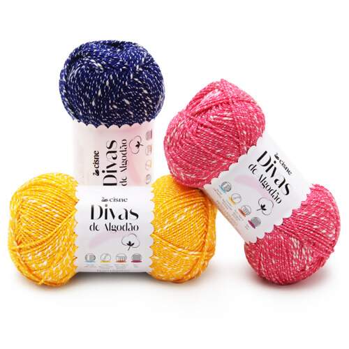 Ainda, as criações ficam muito mais divertidas com Divas de Algodão, isso porquê, o algodão presente na construção do fio, forma pequenos pontinhos brancos que contrastam com o restante do fio.