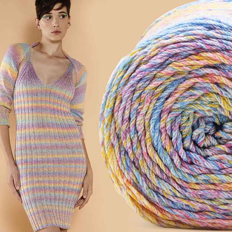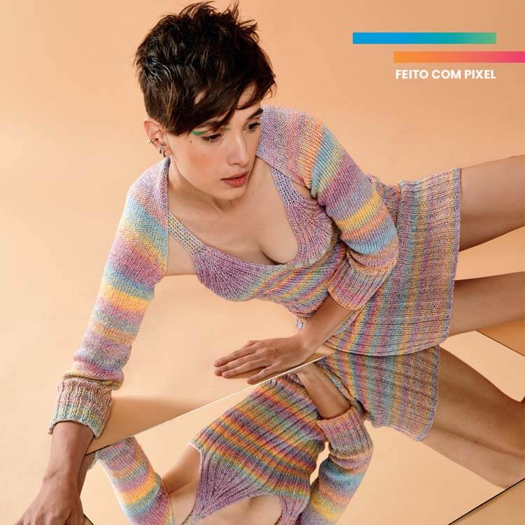 Forma um efeito ótico inusitado criando padrões com listras multicoloridas. Ideal para blusas, vestidos xales, regatas, entre outros. Fio ano todo.