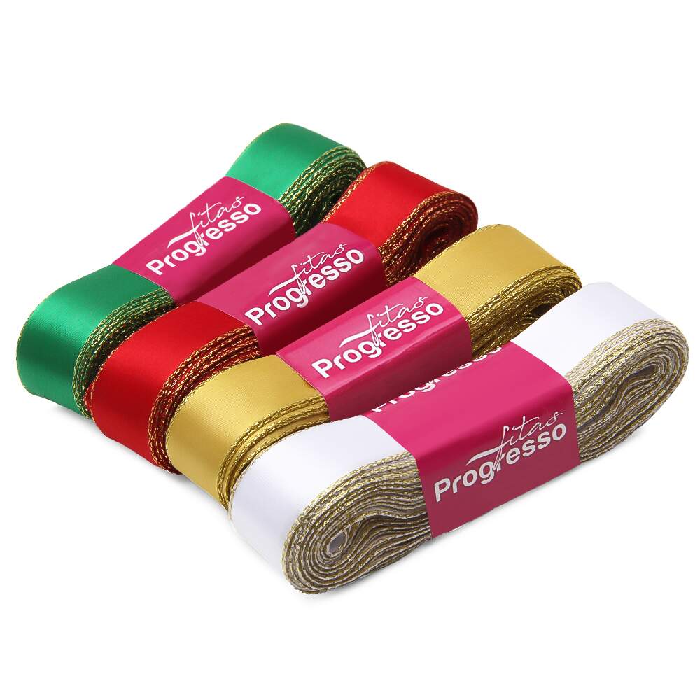 Descrição Fita de Cetim Com Ourela Dourada N.05 Progresso 22mm 10mts