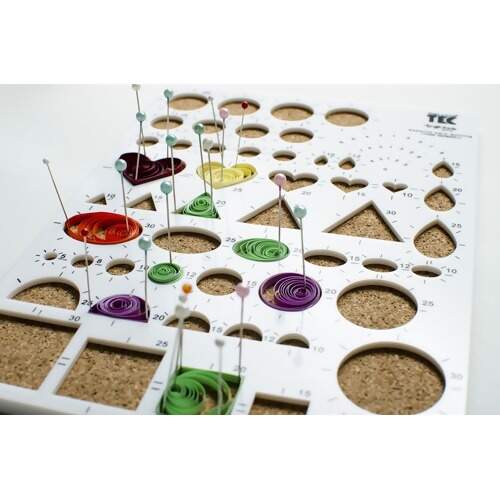Gabarito para técnica Quilling, utilizado de formas básicas. Possui marcações em milímetros e fundo em cortiça, para uso de alfinetes durante a fixação dos papéis nas formas escolhidas.