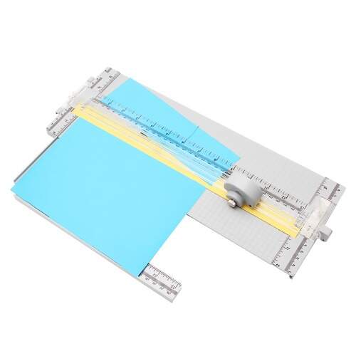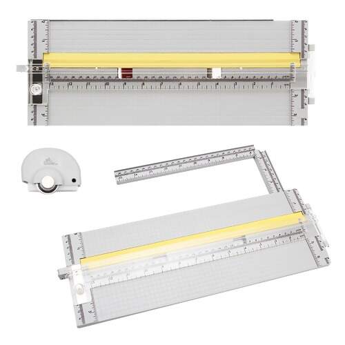A Guilhotina tem marcação em centímetros e polegadas. Possui grade de baixo relevo com espaçamento de ½ polegada. Dispõe de uma placa magnética para fixar e facilitar o uso da régua móvel. Também conta com uma régua extensora e dobrável. Seu Sistema de corte rotativo possui sistema de segurança e seu refil de corte é móvel.