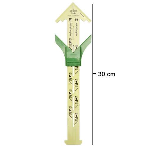 Use o Medidor de Triângulos Sem Aborrecimentos para dar tamanhos de bloco para triângulos quadrados de 1/2 e 1/4: 2,5 "(64 mm), 3,5" (89 mm), 4,5 "(114 mm), 5,5" (140 mm), 6,5 "( 165 mm)