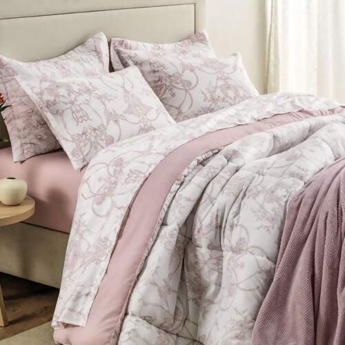 Renove seu quarto com o Jogo de Cama Casal Prisma, ideal para proporcionar conforto e charme ao ambiente. Confeccionado em percal 100% algodão 160 fios, o tecido encorpado oferece suavidade ao toque, boa respirabilidade e é antipilling e hipoalergênico, garantindo noites de sono tranquilas e maior durabilidade. O conjunto inclui um sobre lençol estampado de 2,20m x 2,40m em delicados tons de branco e rosa, lençol com elástico de 1,38m x 1,88m x 30cm que se ajusta com facilidade ao colchão, e duas fronhas de 50cm x 70cm com três abas de 2cm, unindo elegância e praticidade.