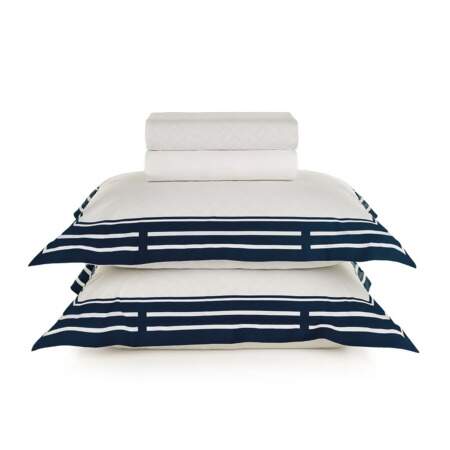 Renove sua cama com o Jogo de Cama Barcelos King, sinônimo de conforto e requinte. Produzido em 100% algodão 200 fios, seu tecido encorpado e respirável proporciona noites agradáveis e relaxantes. Com tecnologia antipilling e acabamento hipoalergênico, o conjunto oferece durabilidade e cuidado extra com a pele. Acompanha sobre lençol estampado (2,90m x 2,50m) com vira pronta e bainha clássica, lençol com elástico (1,93m x 2,03m x 40cm) e duas fronhas (50cm x 70cm) com quatro abas de 4cm e estampa posicionada, criando uma moldura sofisticada. A paleta em branco e azul traz frescor e elegância ao quarto.