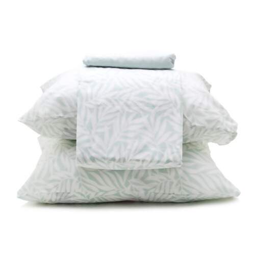 - Jogo com 4 peças sendo um lençol superior, um lençol com elástico e uma fronha, indicado para camas tamanho casal.