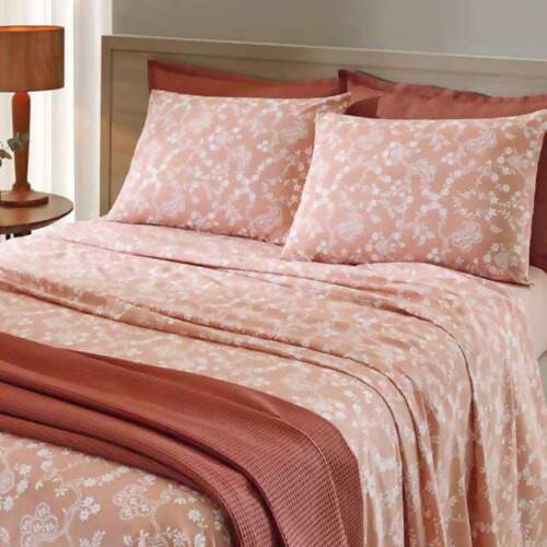 - Jogo com 4 peças sendo um lençol superior, um lençol com elástico e uma fronha, indicado para camas tamanho casal.