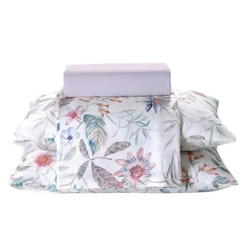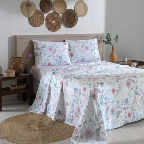 - Jogo com 4 peças sendo um lençol superior, um lençol com elástico e uma fronha, indicado para camas tamanho casal.