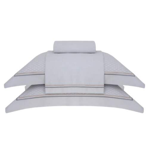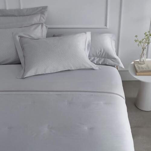 Jogo de cama King Vision Basilic. A coleção Basilic traz uma combinação única de elementos geométricos, que realçam modernidade e sofisticação. Detalhes decorativos em ponto cheio com tons metálicos formam uma moldura elegante no sobrelençol e nas fronhas. A estampa em cinza adiciona textura e características às peças, permitindo composições modernas e criativas. A Buddemeyer é sinônimo de qualidade e estilo incomparáveis.