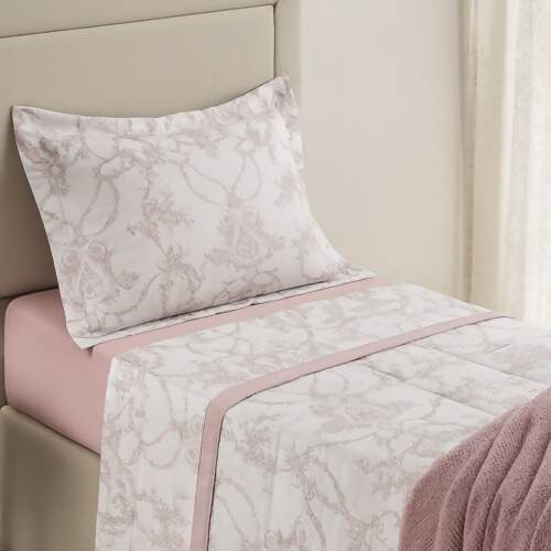 Encante-se com o Jogo de Cama Solteiro Prisma, ideal para renovar o quarto com charme e proporcionar noites de descanso únicas. Produzido em 100% algodão 160 fios, oferece um toque macio, excelente respirabilidade e é resistente ao desgaste. O tecido antipilling e hipoalergênico assegura durabilidade e cuidado com a pele. O jogo inclui um sobre lençol estampado (1,80m x 2,40m), lençol com elástico (1,00m x 2,00m x 30cm) e uma fronha (50cm x 70cm) com três abas de 2cm. Em tons suaves de branco e rosa, combina elegância com praticidade, perfeito para um ambiente acolhedor.